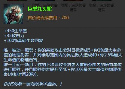 我们假设后期剑圣的血量最低为3000,那么这一件装备的基础攻击就等于50AD+35的平A伤害。而AOE输出是40+75的伤害。而主动的伤害是40+300的伤害,这些伤害配合剑圣的高攻速,可以打出不小的输出。这还是保证剑圣足够肉的情况下打出的输出。