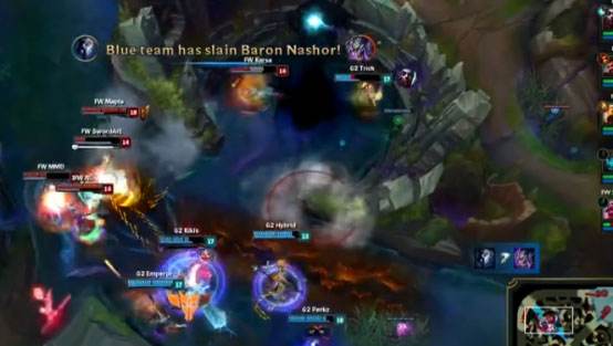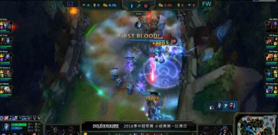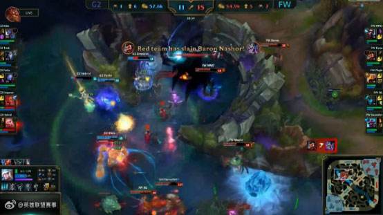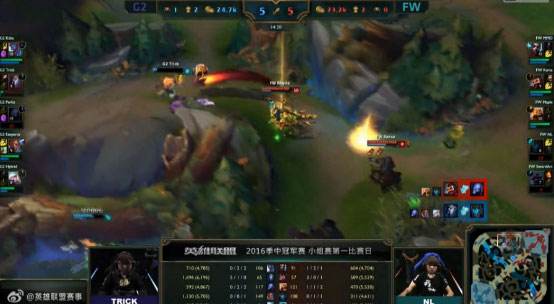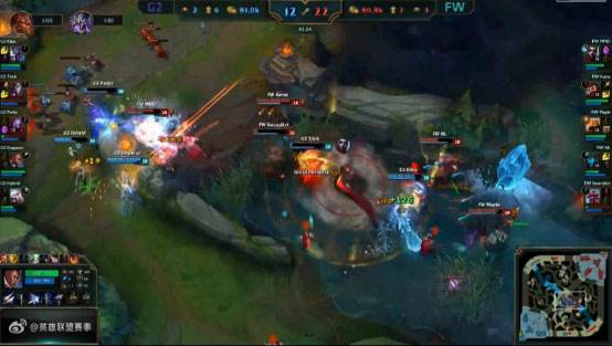 40分钟G2推上路高地,但是被FW强开先杀卢锡安,FW一波0换3,破中路高地水晶。43分钟FW敌方红区阴人,抓住风女逼掉闪现大招,随后团战中G2阵型被河道分割,FW0换3一波取胜。