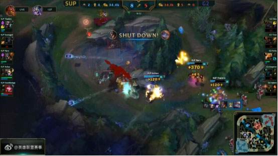 首先来看一下BP,可以看到外卡赛区在BP上越来越与各大赛区接轨,而且不失自己的风格,而G2反手则是BAN掉了SUP昨天获胜的比赛中表现不错的英雄。双方前期由于是一个换线局,所以战斗发生的有些晚,比赛进行到9分钟,双方在下路打出一波1换1,但是G2利用局面上的优势又拿到了一座中塔。13分钟SUP抓到滑板鞋在下路单带的机会,千珏和卡牌直接将其抓死,但是G2队友支援过来直接收掉了两人。并且在追击过程中巴德和艾克来了一拨互换,总的来说这波团战G2打了一波2换3。16分钟卡牌再带节奏,配合千珏再次抓死了滑板鞋。而且SUP一波推掉了G2的上路高地。紧接着在19分钟,G2在中路想要抓死SUP的辅助莫甘娜,但是莫甘娜躲掉N多技能后逃脱,随后SUP其他队员赶到,围着G2一通猛打,直接打出一波1换4,而且拿到了G2的中路一塔。