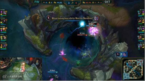 先来看一下双方BP,FW先手封锁了SKT有可能出现的套路英雄,而SKT则是更多了封锁了FW的中单的英雄池。比赛前期双方虽然各有动作,但是都是干打雷不下雨,都没有拿到人头,但是比赛进行到12分钟,BLANK入侵闪电狼野区被蜘蛛抓到,闪电狼其他队友赶来直接配合蜘蛛收掉了男枪的一血。之后蜘蛛来到下路,配合己方下路直接收掉了BANG的人头。17分钟,蜘蛛和沙皇在中路草丛蹲男枪但是SKT支援赶来,双方打了个一换一。28分钟,SKT利用自己兵线的优势想要偷一波大龙,但是闪电狼蜘蛛赶到,抢下了这条大龙。而且闪电狼随后在中路开到了男枪,直接做掉男枪推掉了SKT的中路高地。
