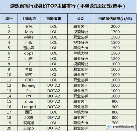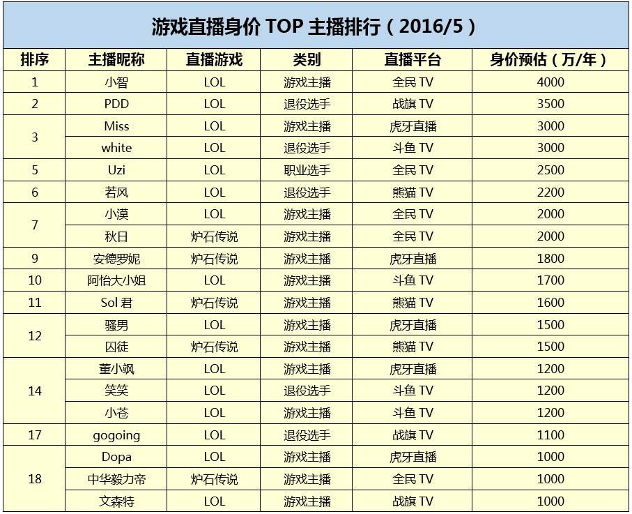 与此同时,在过去一年间,游戏主播身价也水涨船高,甚至出现身价翻倍的情况。2015年初流传出当时的主播身价排行,TOP20的主播主要是被YY、斗鱼包揽;随着竞争加剧,经过一年多的洗礼,TOP20身价主播也有所更新,而主播也从集中平台,流向创业型公司全民TV、熊猫TV等。