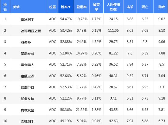 当前版本胜率较高的普遍是无位移高输出的AD,其中以艾希为首。改版后的艾希主强在中前期,无尽和攻速装初成时R先手或者辅助先手,利用AQAW切除后摇可以打出一套不小爆发。