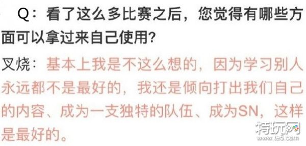 另外当时叉烧还表示:比如学习别人的打法,自己更倾向于把SN打造成一支独特的队伍。现在SN独特的双中单摇摆体系,再加上Angel卡牌支援体系,可以说是LPL独一党了,最关键是这种打法能赢,就是最好的证明。