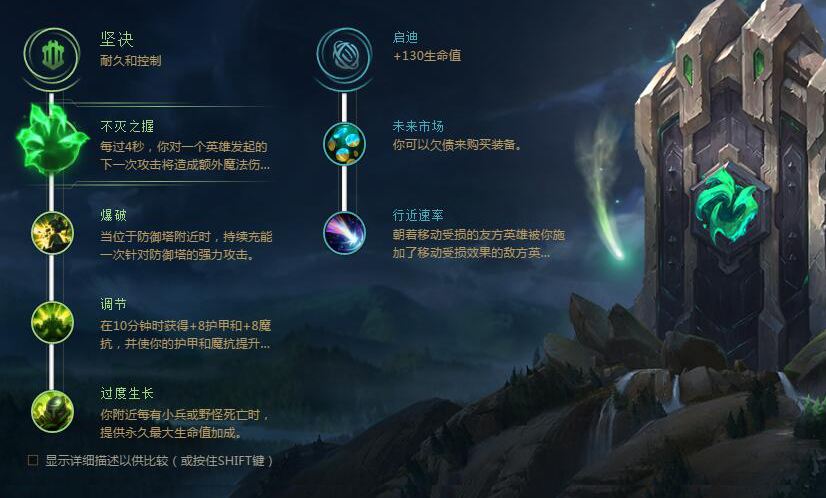 约里克召唤出友军英雄的亡魂。此亡魂拥有目标友军45/60/75%的攻击力,可持续10秒。当亡魂存在时如果友军死亡,亡魂会牺牲自己,鼓舞友军继续作战一段时间,最多10秒。