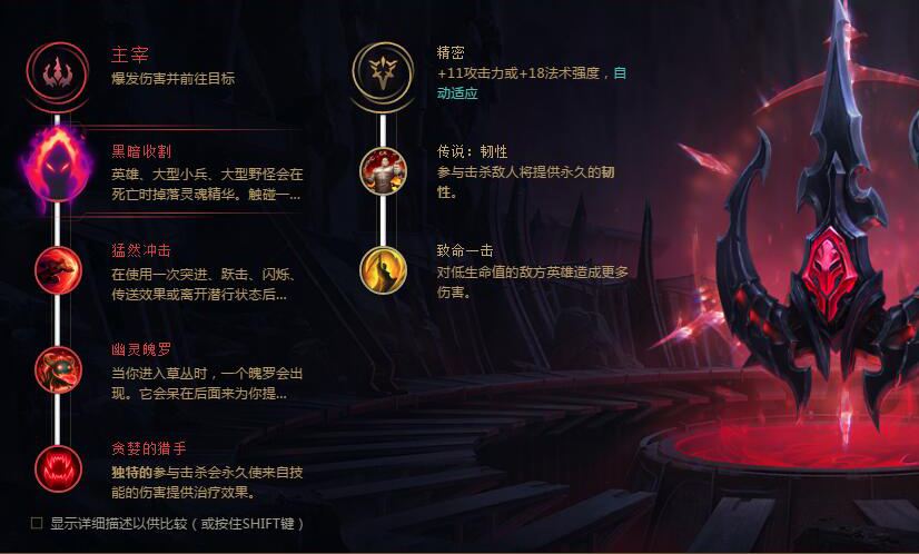雷克顿用黑暗能量环绕自身,持续15秒,获得200/400/800点生命值。激活时会每秒对周围敌人造成30/60/120(+0.1*法术强度)点魔法伤害,并且会每秒获得5点怒气。