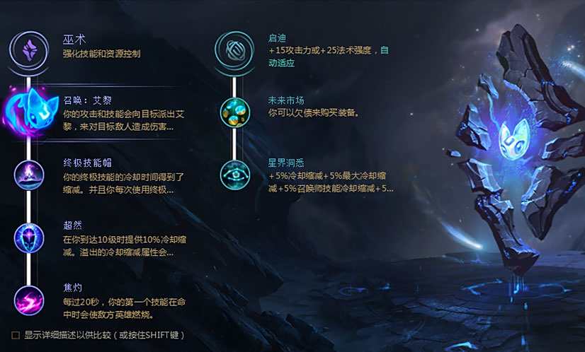 目标友军获得一层持续4秒的护盾和持续1.5秒的40/45/50/55/60%移动速度加成。护盾能吸收80/110/140/170/200(+0.5*法术强度)伤害。