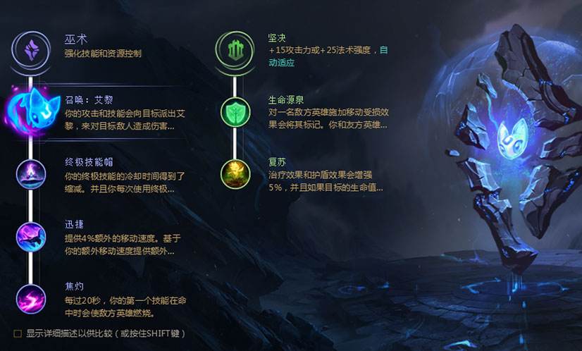 迦娜为目标友军英雄或防御塔施放一个护盾,护盾最多可持续 5 秒。护盾最多可以吸收 80/120/160/200/240(+0.7*法术强度)点伤害,并能为目标提供 14/23/32/41/50(+0.1*法术强度) 的攻击力加成,直到它被破坏为止。