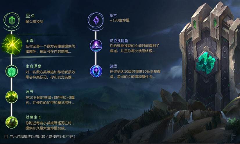 激活:附近的敌人每秒将受到8/12/16/20/24魔法伤害,并且每秒损失他们1/1.5/2/2.5/3(+0.01*法术强度)%的最大生命值。