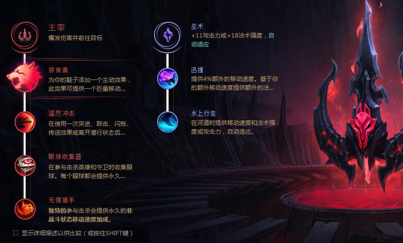 激活:沃里克能够感知到附近1500/2300/3100/3900/4700范围内生命值低于50%的敌方英雄的行踪。发现虚弱英雄后,沃里克增加20/25/30/35/40%的移动速度,并使不在潜行状态下的敌人暴露在己方视野中。