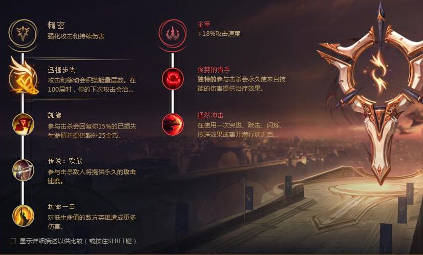 主动:移动速度提高25/35/45%,攻击速度提高30/55/80%,并且免疫所有减速效果,持续10秒。在激活时,击杀或者助攻都会使高原血统的持续时间延长4秒。
