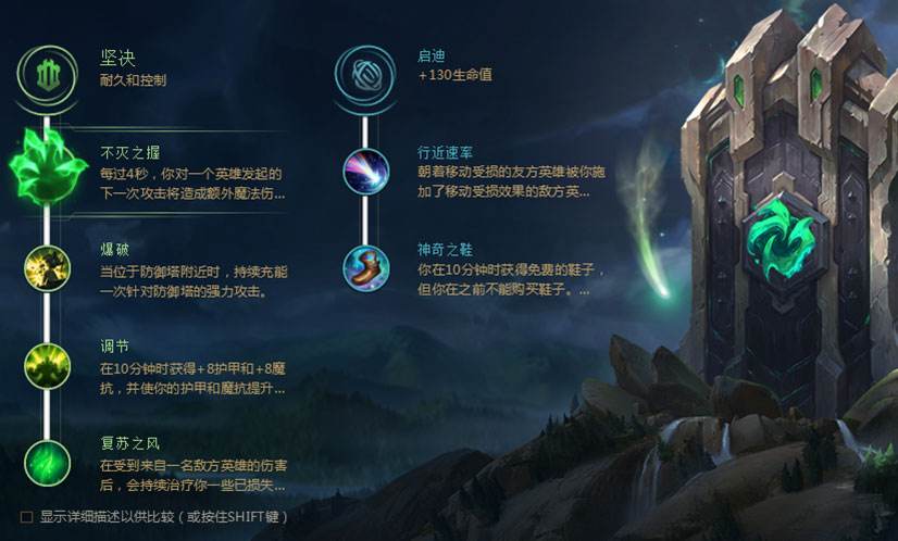 被动:在这个技能尚未进入冷却阶段时,所承受的伤害会转化为灰色生命值。一旦灰色生命值开始衰减,那么灰色生命值的20/26/32/38/44%就会转回正常生命值。 主动:将你所有灰色生命值转化为一个持续6秒的护盾,但会随着时间逐渐衰减。