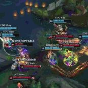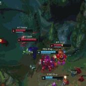 前期:双方均是围绕着下路进攻,KT通过更为老练的经验在下路的交锋中拿到领先,取得初步的优势。但EDG通过一波灵活的转线,在上路拿下峡谷先锋后与KT接团完成1换4将差距扳回,前期EDG并没有落后KT。