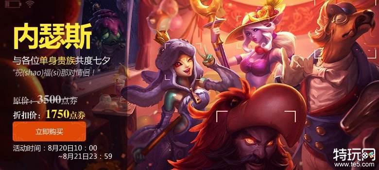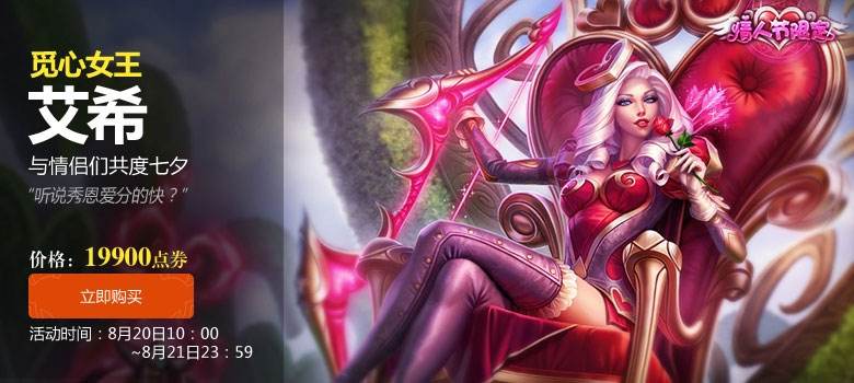 七夕将至,在这个充满爱的日子,情人节限定皮肤——“觅心女王 艾希”也将限时上架。同时,“单身贵族 内瑟斯”将会限时半价销售。