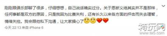 刚刚跟俱乐部聊了很多,仔细想想,自己说话确实过分。关于恩断义绝其实并不是那样,任何事都是双方的原因,只是我因为比赛失利,还有长久以来各方面的抨击而失去理智,情绪失控。我会跟他私下沟通,让大家操心了。