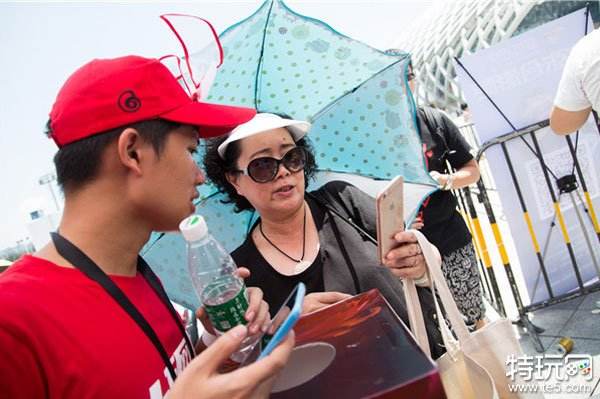 一位着装洋气的大妈正在向场馆工作人员咨询问题。肩上蓝色的遮阳伞阻隔了深圳烈日的炙烤,黑色的墨镜淹没不了她眼中激动地情愫,微微蹙起的眉头,让岁月的痕迹真实的在脸庞上蔓延。