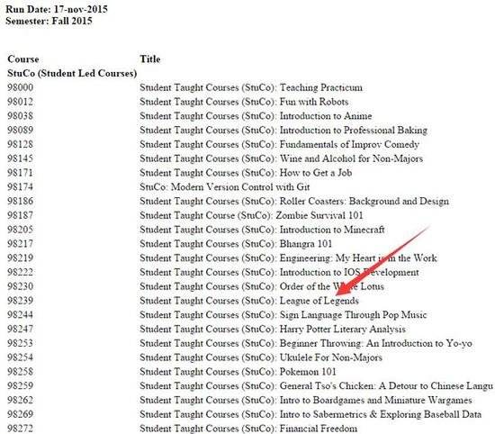 就是这么牛的学校,在他们的2015年秋季课程中,赫然出现了《Student Taught Courses (StuCo): League of Legends》这一条科目!