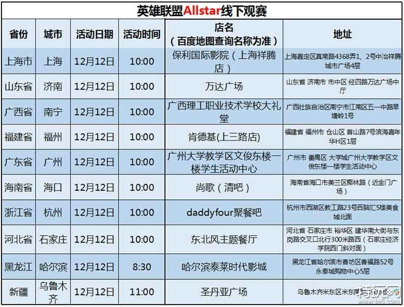 《英雄联盟》全明星赛线下观赛活动将于12月12日上午在上海、济南、南宁、福州、广州、海口、杭州、石家庄、哈尔滨、乌鲁木齐等十城同时展开。届时十城及周边玩家可以前去活动现场,一起为LPL全明星队加油助威。