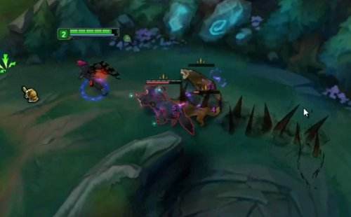 走到图中所示位置保证Q能打到3个野怪,之后利用走位不停的Q,在要回头的时候跟野怪对A一下继续边走边Q。