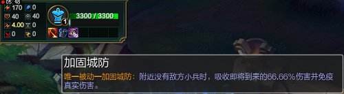 加固城防是所有防御塔都拥有的能力,在附近没有敌方小兵时会减少即将到来的66.66%伤害,并且免疫真实伤害。在减少约三分之二的情况下,我们的攻击还会受到防御塔的护甲以及魔抗的伤害减免,因此没小兵的时候最好不要贸然强拆防御塔。