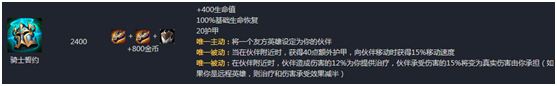 骑士誓约提供了大量的生命值,生命恢复和护甲。这件装备单看基础属性可能并没有什么特色,但它的技能却非常的强大。骑士誓约能够将一名友方英雄设定为伙伴,在伙伴附近时会获得40点额外护甲。在伙伴附近时,伙伴造成的伤害的12%将会为你提供治疗,伙伴承受伤害的15%将会变为真实伤害由你承担(如果你是远程英雄,则治疗和伤害承受效果减半。)