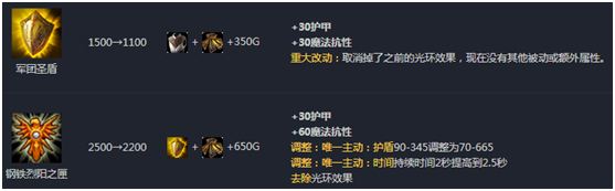 军团圣盾和钢铁烈阳之匣这两件装备移除了光环效果,但同时也大幅降低了价格。单性价比来说,军团圣盾的价值略微下降了,因为它不再提供魔抗光环的效果,但是钢铁烈阳之匣的性价比却获得了提升。