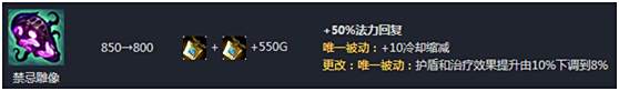 禁忌雕像的被动护盾和治疗效果提升由10%下调至8%,同时装备总价从850下调至800