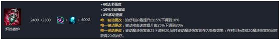 香炉的法力恢复似乎被移除了,但移速加成变为了基础属性。被动治疗和护盾提升由15%下调至10%,被动攻击速度提升有25%下调至20%,被动魔法伤害由25下调至20,同时被动魔法伤害现在为吸取效果:在对目标造成20伤害的同时获得20点治疗。