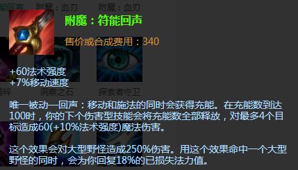 接着就是打野装备附魔的选择,一定要是符能回声,虽然寡妇也有AD流派,但在如今的版本中,符能回声的版本绝对是最强的,这也是寡妇爆发的来源之一。