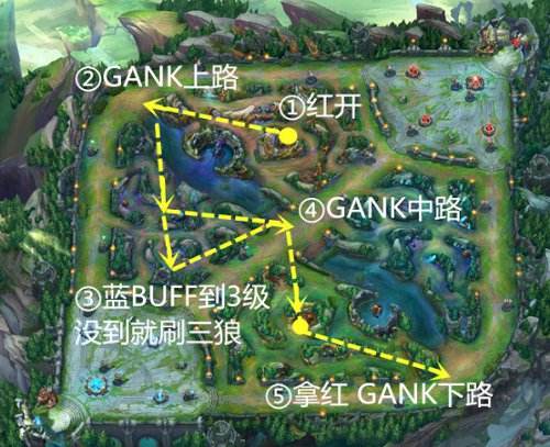 解释一下,这是以蓝方为例的刷野路线,红方的话其实差别不大,GANK路线基本一致,差就差在了刷野升级的路线,但是即使你在红方,起手也一定要红开,一定要记住,无论是蓝方红方,绝对要红开!