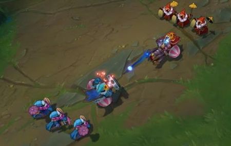 怎么控线:控线一般思路就是只补小兵的最后一刀,如果有几个小兵同时残血可以平A配合技能补刀,这样可以减少漏刀数,还有就是如果对面一堆兵进塔,而我方小兵还没有上线,可以选择用身体抗住兵线不让小兵进塔,因为一旦兵线进塔,防御塔就会很快速的清掉对面小兵,从而兵线就会往对面推。比如下面这种情况,就可以选择用身体卡住小兵,然后稍微向左走位,让小兵跟着你,等到你的小兵到达。