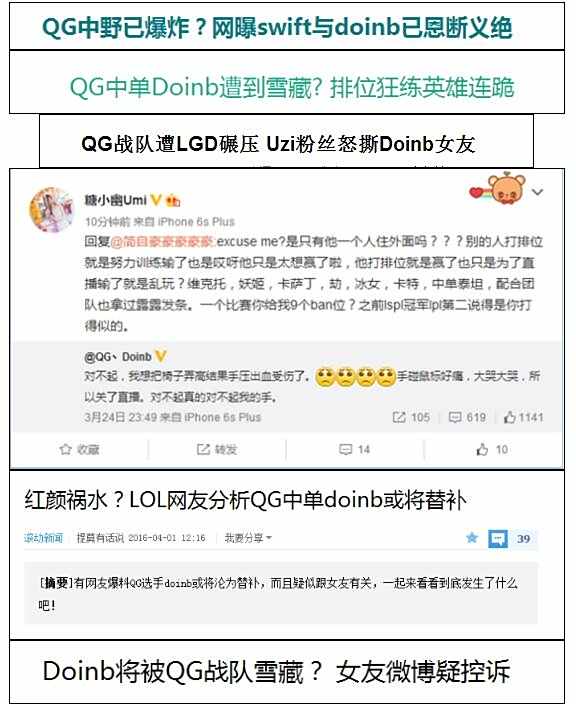 Doinb在微博直言不能在俱乐部直播,但其队友swift和UZI却可以在俱乐部进行直播,传达的信息太微妙,引人猜测。Doinb不上场的原因有两种分析,一种是与打野矛盾不调和,一种是女朋友带节奏引发矛盾,怒刚小狗粉丝之后又发微博控诉。