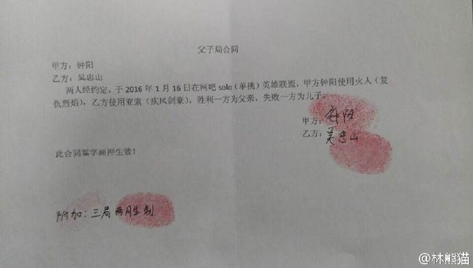 合同原文:两人经约定,于2016年1月16日在网吧solo(单挑)英雄联盟,甲方钟阳使用火人(复仇烈焰),乙方使用亚索(疾风剑豪),胜利一方为父亲,失败一方为儿子。最后还加多了一个三局两胜制。