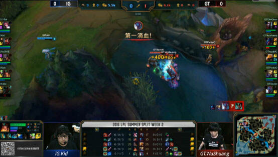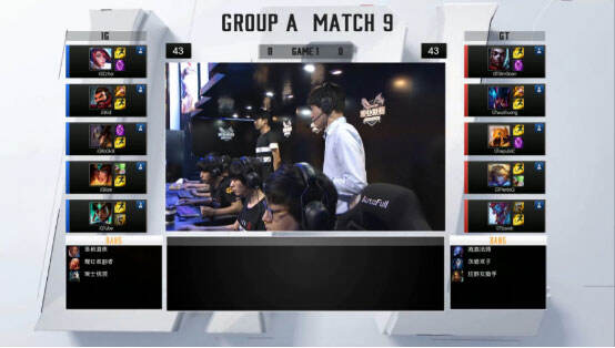 BP阵容:GT扳掉豹女,卡牌和蜘蛛,IG则扳掉流浪,千珏和卢锡安。GT上单艾克,打野男枪,中单卡萨丁,下路轮子妈巴德;而IG上单吸血鬼,打野酒桶,中单杰斯,下路EZ扇子妈。