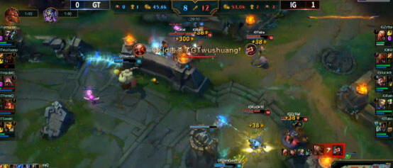18分钟IG3人强行推掉上2塔被GT包夹,虽然IG下路双加速跑得很快,但是艾克传送断后路,沙皇大招推回双C秒掉,剑姬残血逃生,GT取得0换2。