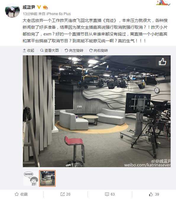 也许是这次取消得过于突然,主持人戚蓝尹微博显得比较生气,称自己放弃了一个工作连夜飞回北京,结果被某女主播强行取消直播,并称离直播一个小时嘉宾和某平台搞崩了取消节目。