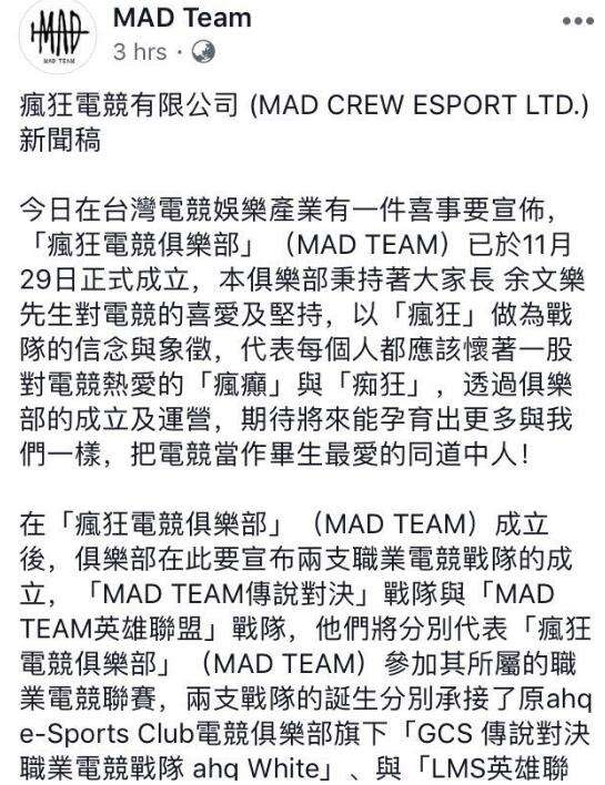 台湾一家新的电子竞技俱乐部宣布成立,稍有特别的是这家名叫MAD Team的新俱乐部是由著名影星余文乐创办的。