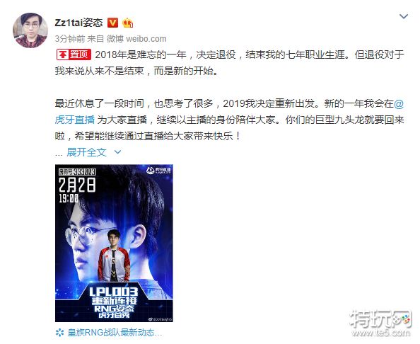 最近休息了一段时间,也思考了很多,2019我决定重新出发。新的一年我会在@虎牙直播为大家直播,继续以主播的身份陪伴大家。你们的巨型九头龙就要回来啦,希望能继续通过直播给大家带来快乐!