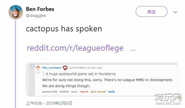 但在这个帖子引起大家热烈讨论的不久后,官方人员The_Cactopus则是回应了这个帖子,他表示拳头游戏并没有打算制作一个开放式世界的全新游戏,目前没有开发英雄联盟MMO类游戏,但他也表示开发团队确实在制作另一些东西。因此,The_Cactopus澄清了一个事实,英雄联盟并不会推出一个魔兽世界那样的MMORPG游戏。