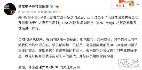 RNG官博随后也发布了公告:俱乐部在与选手多次沟通后,出于对选手个人的身体因素的考量以及尊重选手个人的意愿原则,RNG-MLXG将暂离春季赛赛场进行休养。