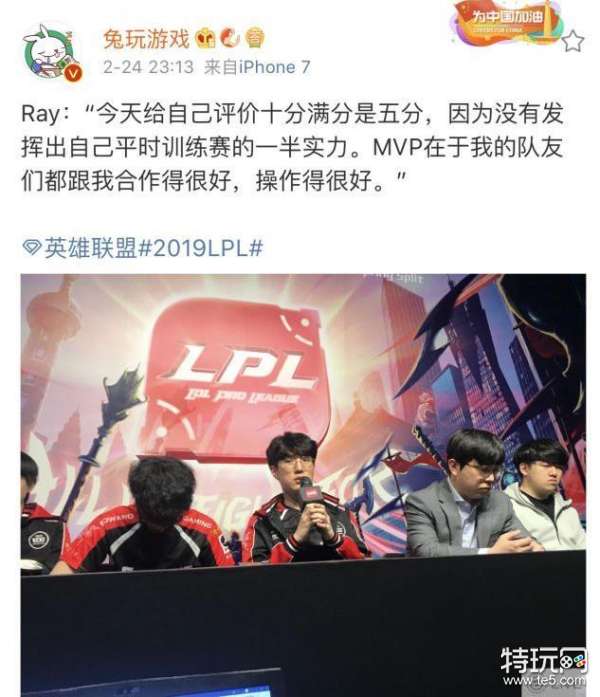 因为Ray这两场的表现很出色,所以赛后采访的时候,有记者询问:今天这两场比赛表现得非常出色,拿到了两场MVP,你怎么评价自己得表现呢?Ray亲口回答:十分满分的话只给自己打五分,因为自己今天的表现,还没有训练赛得一半实力,多亏了队友配合得好,才拿到了MVP。