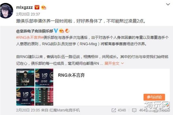 Mlxg直播发病引粉丝担心 RNG官博出面回应