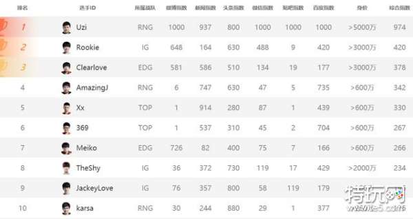 率队夺冠的冠军中单Rookie也一举逆袭,成为了榜单第二。不过Rookie的成名也不仅仅由于成绩,更是他可爱的性格和对LPL的忠诚热爱。作为最良心的韩援,Rookie根本不需要翻译,甚至自己都做起了翻译,更是对中国有着无限的热爱,这让其各媒体指数也相当之高。