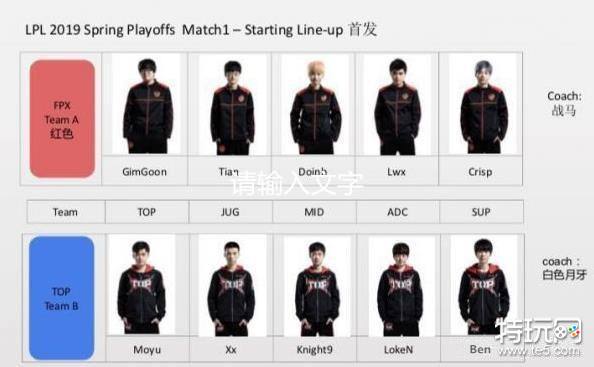 FPX的首发阵容没有太大变化,上单gimgoon,打野Tian,中单doinb,下路LWX加刘青松;TOP这边有小变动,上单moyu,打野XX,中单knight,下路Loken和ben。