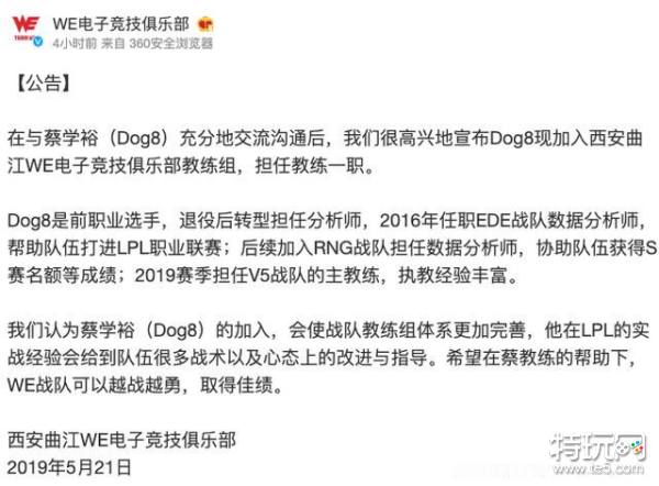 LPL夏季赛即将开打,各大俱乐部也都在这段时间招兵买马,其中WE战队在近日就宣布主教练微笑卸任的消息,一时间引发不少网友的感慨,不过微笑走了并不代表主教练的位置悬空了,补位的正是前V5教练,风哥爱徒蔡学裕(Dog8)!