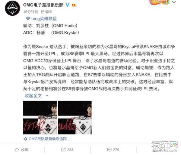 OMG战队官方通过微博发布公告,表示原Snake战队AD选手Krystal(水晶哥),从即日起正式加盟OMG,除了Krystal之外原Snake的辅助辅助hudie也被OMG签下。他们俩将作为OMG的全新下路在夏季赛中登场。