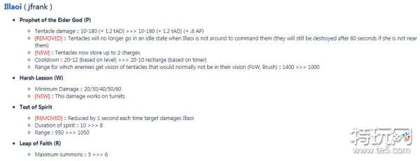 被动 古神先知:触手伤害由10-180(+1.2AD)改为10-180(+1.2AD) (+0.6 AP)[改动] 当俄洛伊不在附近时,触手不再进入休眠状态。(俄洛伊远离后,触手还会持续1分钟)[新增] 俄洛伊现在能够储存两个触手。被动技能冷却时间成长计算从基于等级改为基于游戏时间。敌人所能获得的触手视野由1400降低至1000。W技能 严酷训诫:最低伤害:20/30/40/50/60[新增] 该技能将可以对防御塔使用E技能 灵魂试炼:[改动] 对俄洛伊造成伤害不再减少1秒灵魂试炼的持续时间灵魂持续时间由10秒降为8秒施放距离由950增加至1050R技能 过界信仰最大召唤数量由5个增加至6个