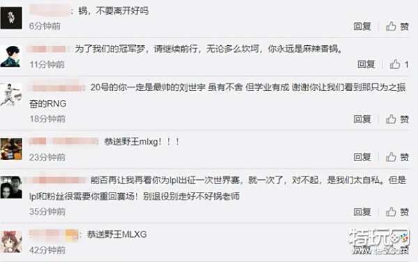 有网友在Mlxg主页留言道:请不要退役,让我再看你为LPL出征一次世界赛,就一次!有网友直言恭送野王Mlxg,还有网友希望Mlxg学业有成,希望在20号看到最帅的刘世宇。