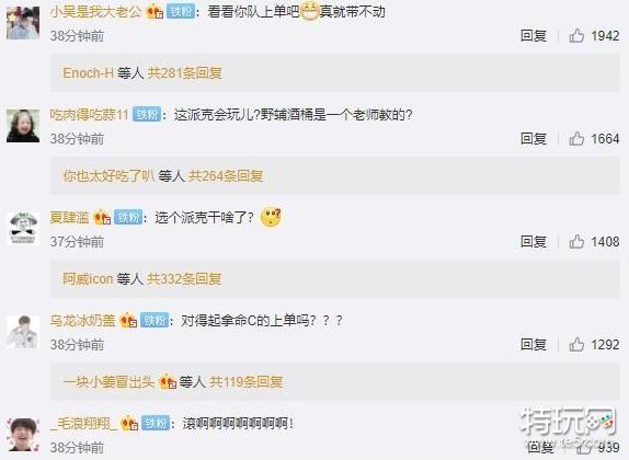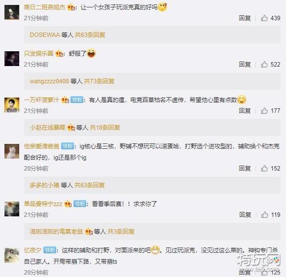 在IG官博最新的微博下方,很多都是在喷打野和辅助的。很多人表示:theshy真的带不动,这个派克会玩吗?野辅的酒桶是一个老师教的吗?选派克出来干啥了?你们对得起拿命C的theshy吗?IG的核心一直都是三C,野辅不想玩就让他们赶紧滚蛋,打野选个进攻型强得,辅助换个和JKL有配合的,IG就还是那个IG,这样的辅助和打野,从来没见过,专门坑自己家队友是吧?打野发挥看心情那还打什么职业?不行就换人行不行?