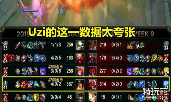 而本场比赛最大的看点也随之到来,那就是Uzi的补刀,从数据统计中可以看到,在30分钟的时间里Uzi补了387刀,这个就有点夸张了,毕竟大家都知道,一名顶尖职业选手的补刀数一般都是跟着时间走的,而Uzi足足多了87刀。可能在这里有小伙伴觉得Uzi又吃三路了,不然怎么可能多这么多补刀。