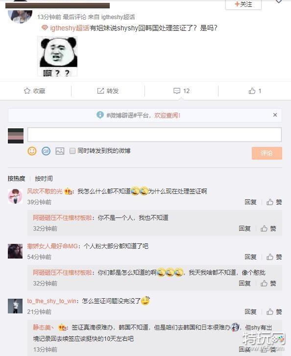 在theshy的超话中,有粉丝询问:theshy回韩国处理签证了,是吗?底下也有粉丝回应:一些大粉丝都知道了,签证真的很难办,大概要10天左右的时间吧。也有人表示听说是打完WE后就回去办签证了,IG和WE的比赛是7月28日结束的,算29日回韩国办签证,按照这个效率大概率赶不上BLG的比赛了。